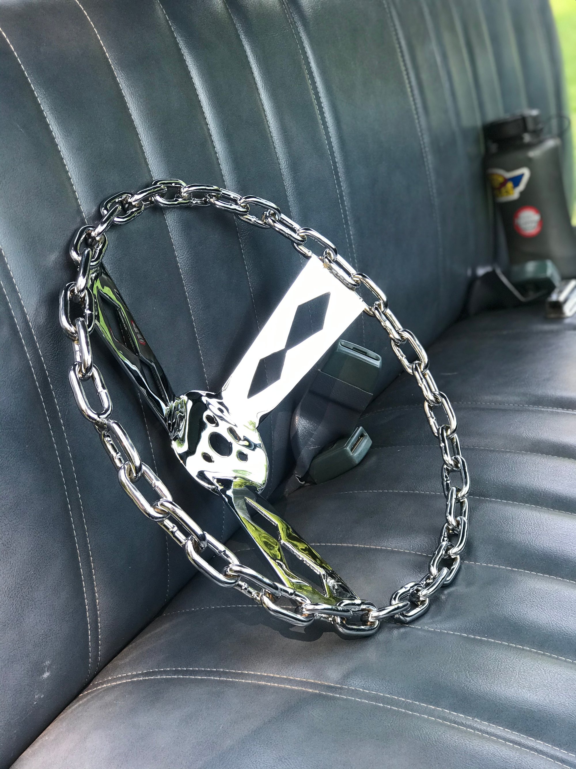 Custom steering wheels. Made from Stainless, 13” diameter, fits most classic vehicles. Made to order by Bobbi (Hot N' Heavy Metal)